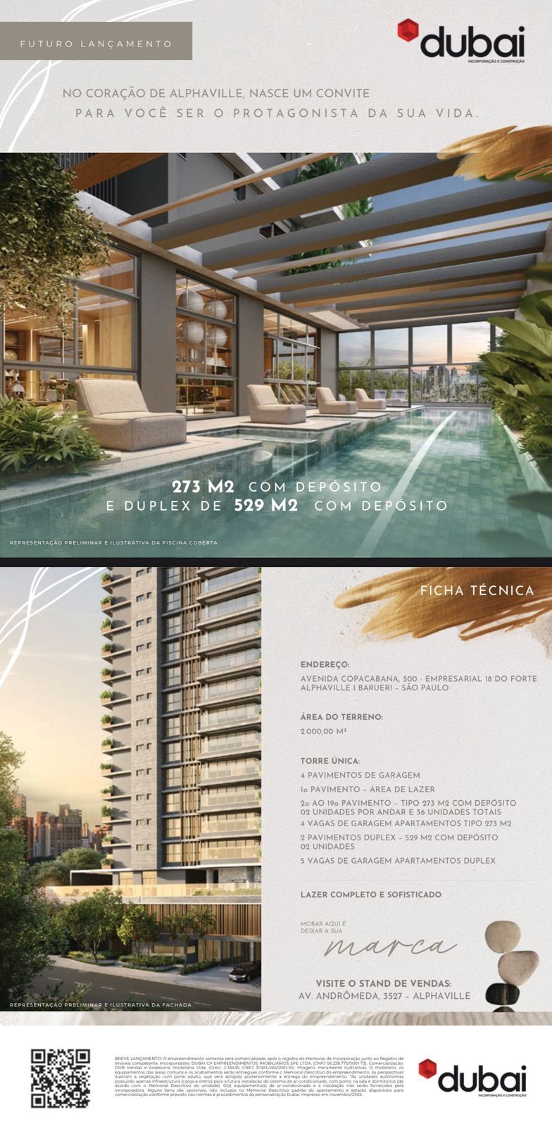 Prepare-se para um novo ícone de sofisticação e exclusividade: o mais novo lançamento da Dubai Incorporação e Construção, localizado na prestigiada Avenida Copacabana, em Alphaville – Barueri/SP. Um projeto arquitetônico imponente, com design contemporâneo e espaços generosos, pensado para quem deseja viver com conforto, estilo e privacidade.